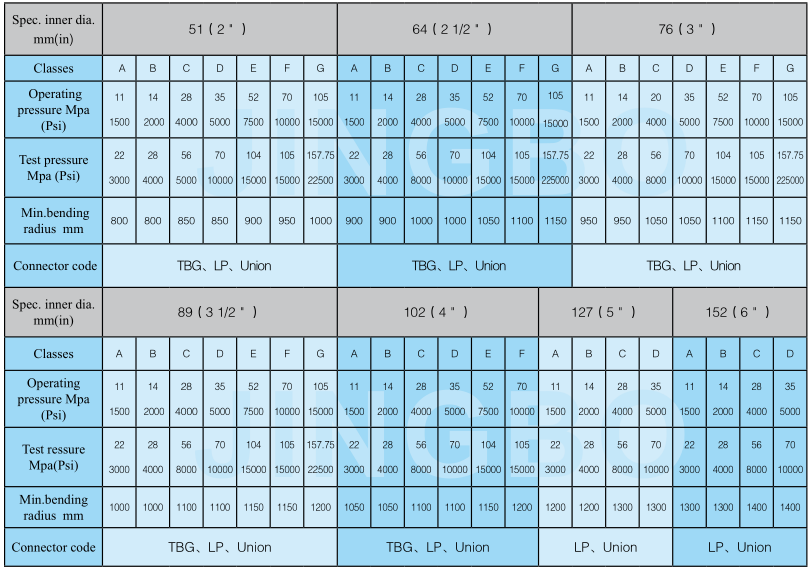 1、Purpose:suitable for rotary hose for flexible connection between the top of the drilling riser and the vertically movable water faucet in the oil drilling and mud delivery systems,and for the adjustment of installing error between the drilling pump line and the riser for the connection and vibration isolation. It is also suitable for delivering in large quantity at high pressure the water-based or oil-based mud with the min. aniline point at 66 ℃ pumped out of rotary drilling equipment.Moreover, it resists to corrosion from hydrogen sulfide and delivers water, oil,mud and other high-pressure media in borehole operation in oil field.